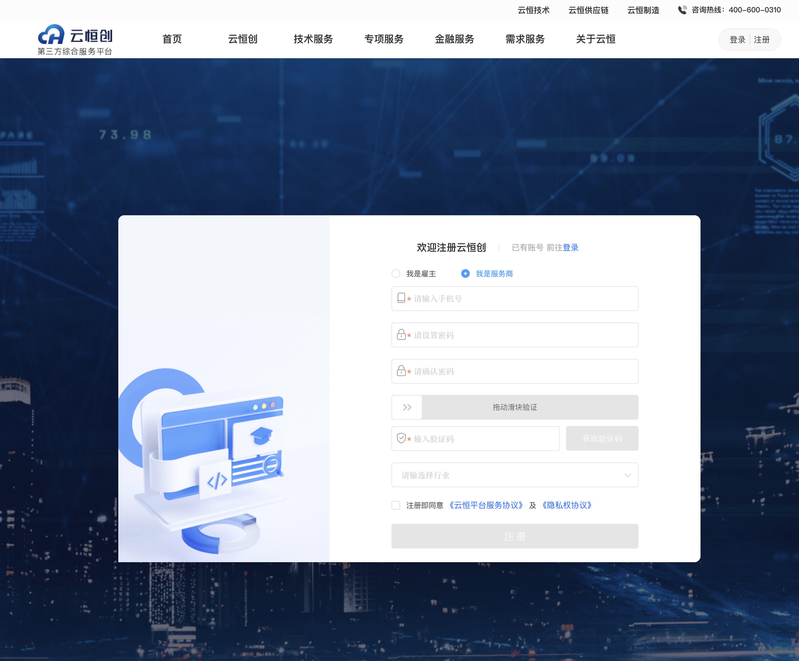 二、根据服务商和个人需求,输入注册所需要的账号、密码等信息。同意平台服务协议后,获取验证码。即可完成注册。
